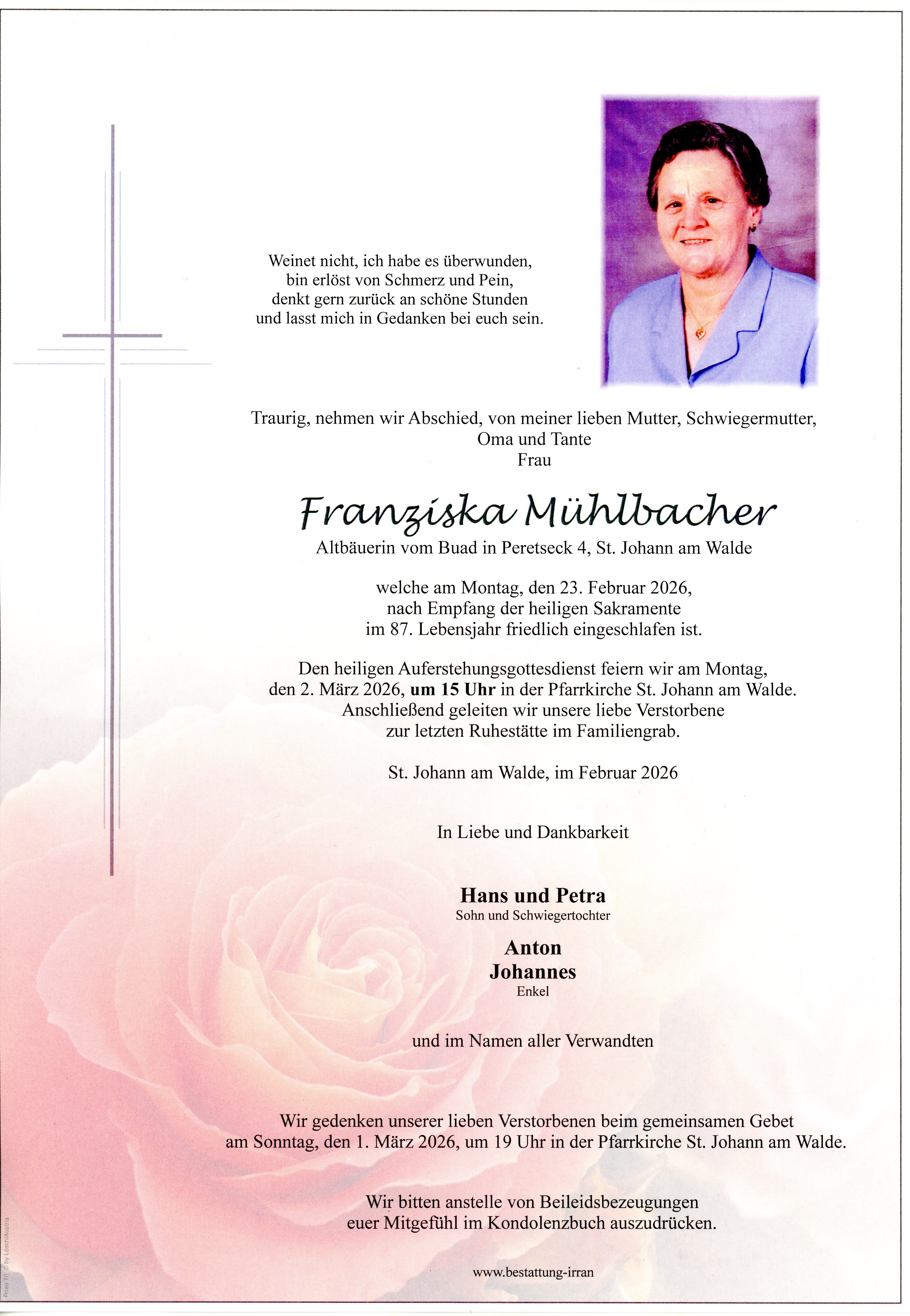 † Montag, 23. Februar 2026 Franziska Mühlbacher St. Johann am Walde zurück