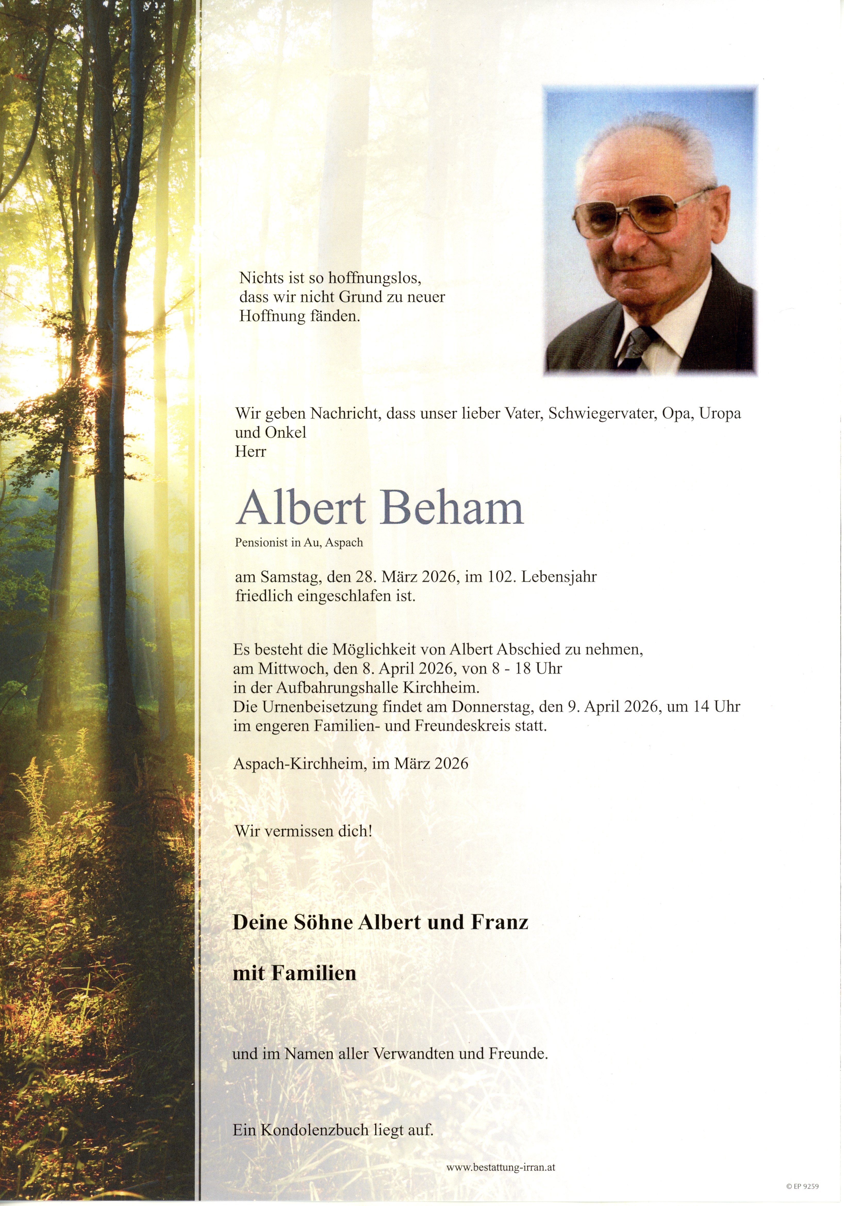† Samstag, 28. März 2026 Albert Beham Aspach zurück