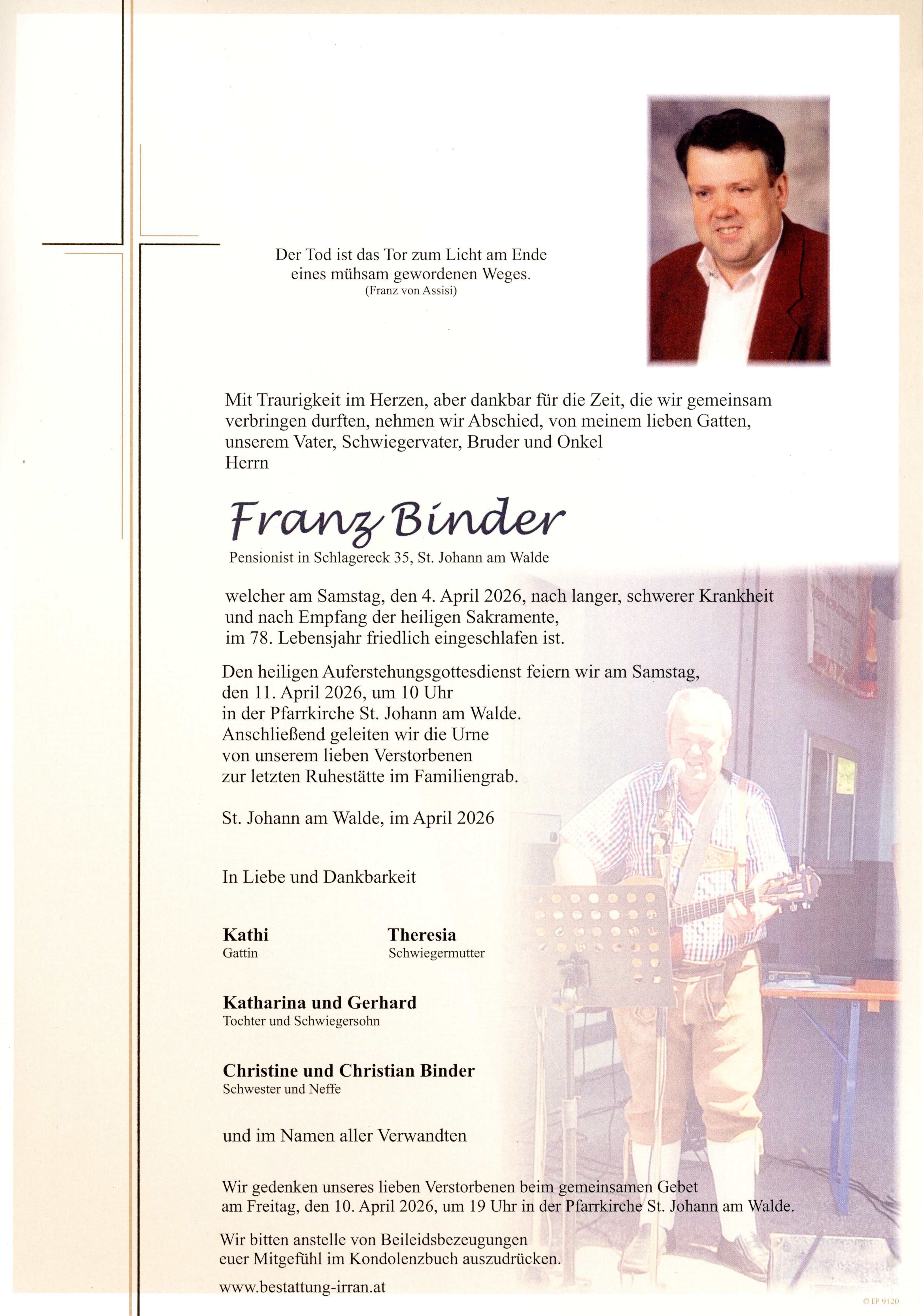 † Samstag, 4. April 2026 Franz Binder St. Johann am Walde zurück